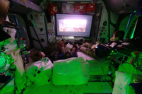 His pictures show the ISS cabin dimmed, a projector screen set up, and the crew seemingly able to make themselves comfortable in the microgravity conditions.