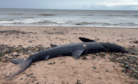 A four-meter basking shark washed up dead on a beach at Portgordon, near Buckie in Scotland, last month, was found to have plastic in its stomach.